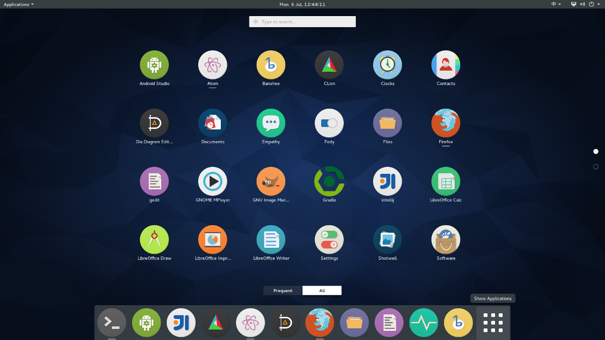 是不是挺美的,底部docker和应用浏览页面。下面说一下gnome的美化方法: